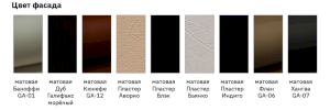 Цвет фасада: матовая Баноффи GA-01, матовая Дуб Галифакс морёный, матовая Кюнефе GA-12, матовая Пластер Аворио, матовая Пластер Блэк, матовая Пластер Бьянко, матовая Пластер Индиго, матовая Флан GA-06, матовая Хангва GA-07.