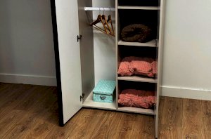 Шкаф оснащён длинными пластиковыми ручками и имеет удобное внутреннее наполнение: слева расположены полки, а справа — две штанги для вешалок. Это позволяет рационально использовать пространство и разместить различные типы одежды.